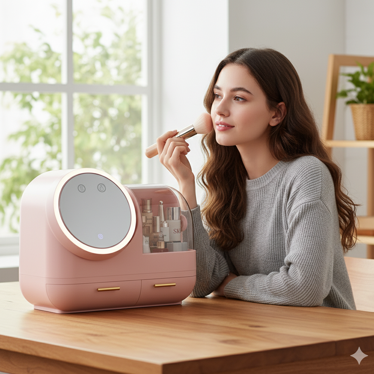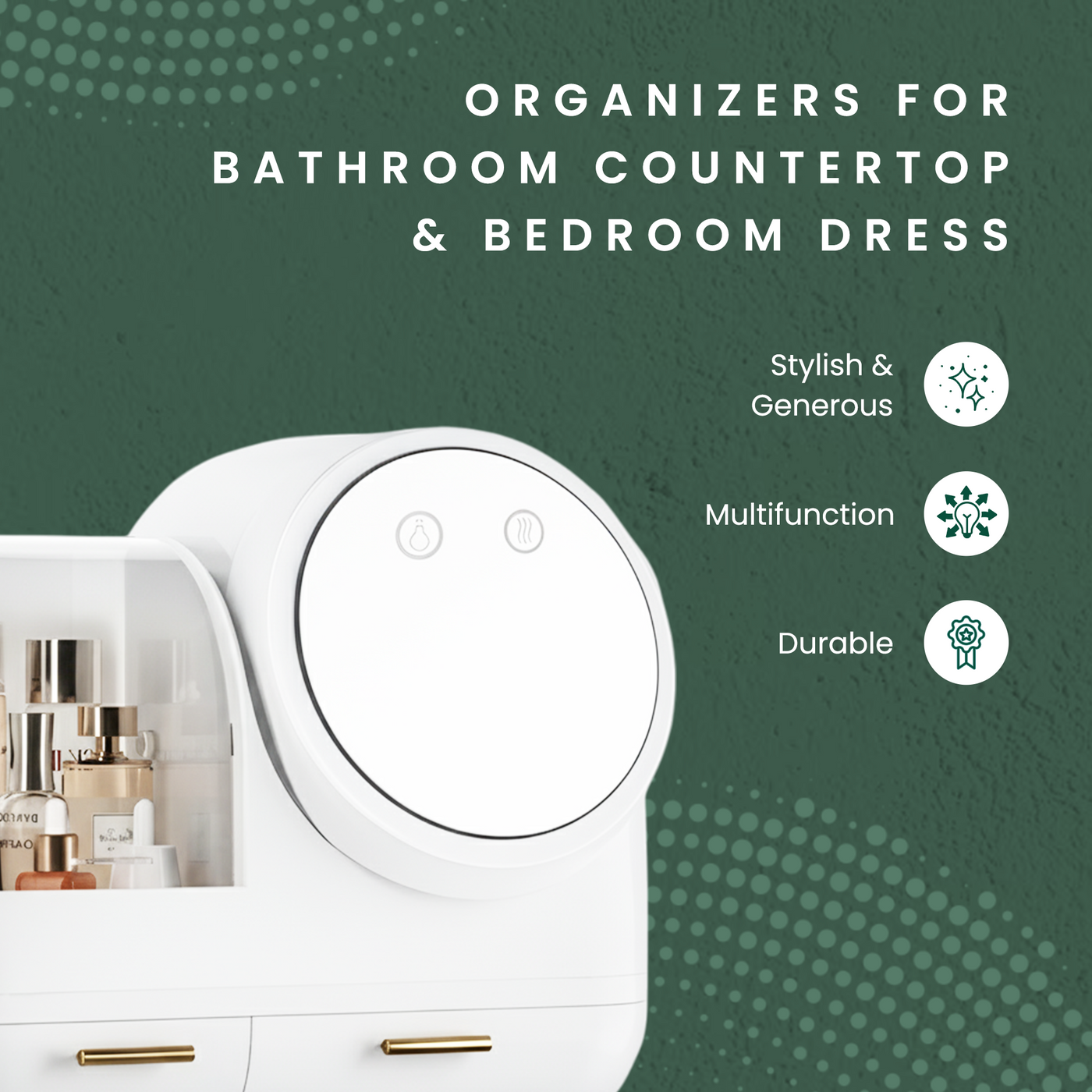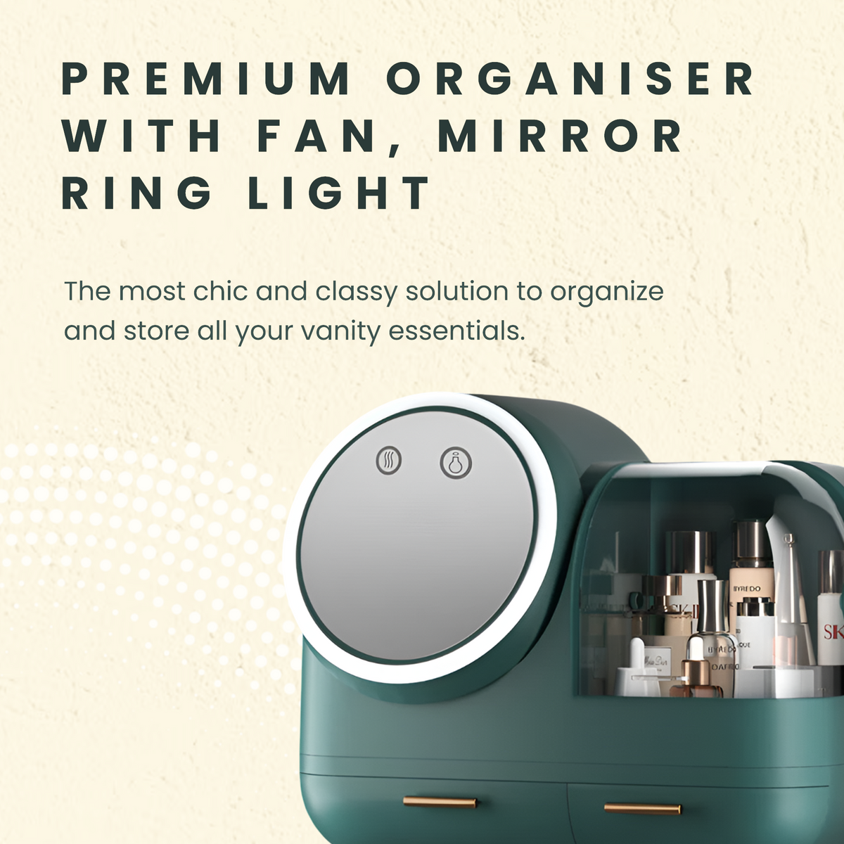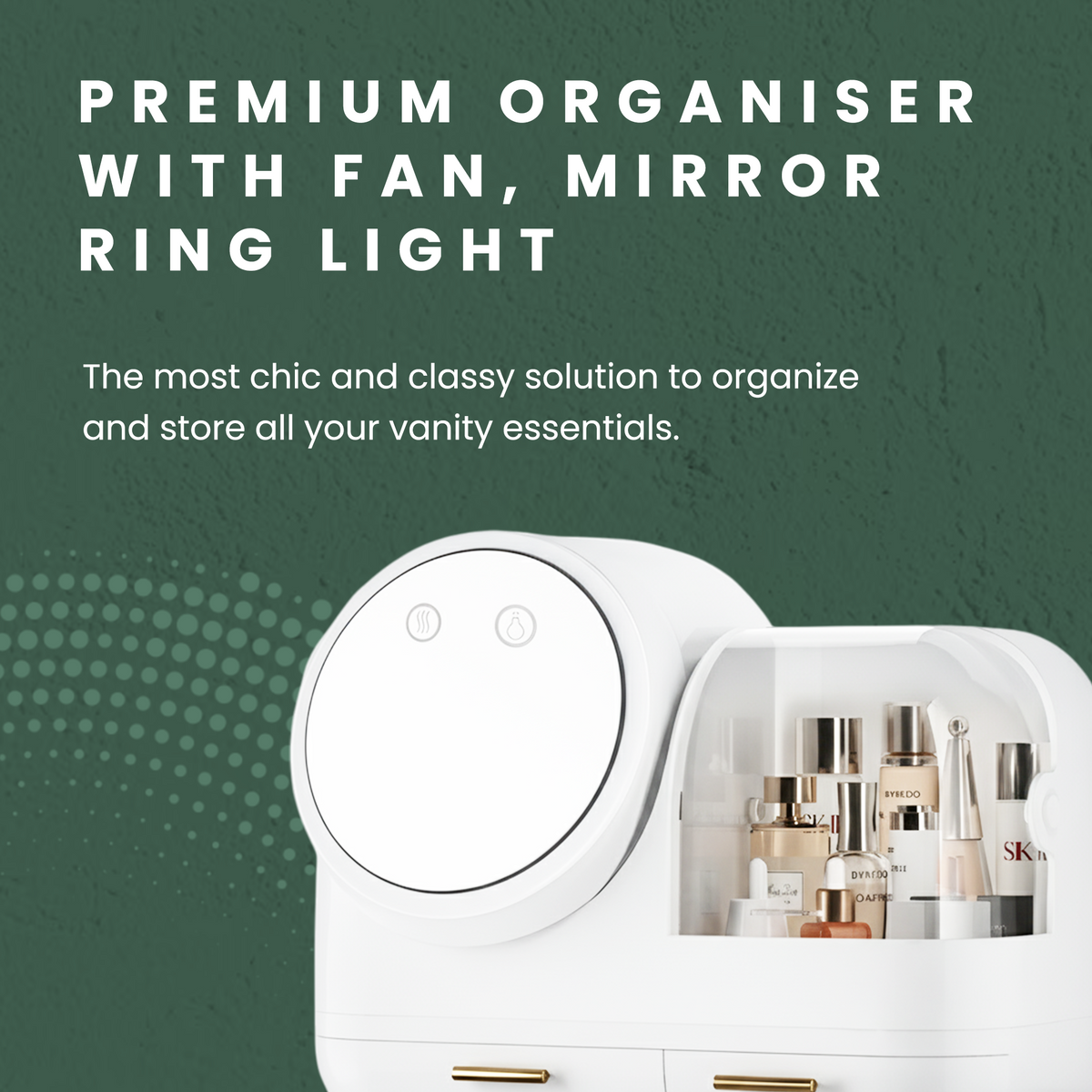 Premium Organiser with Fan, Mirror & Ring Light - White